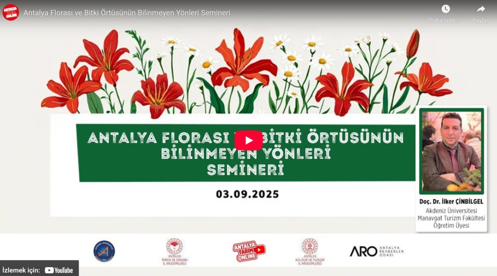 Sayın Doç.Dr. İlker ÇİNBİLGEL anlatımıyla “Antalya Florası ve Bitki Örtüsünün Bilinmeyen Yönleri” konulu seminer düzenlenmiştir. Detaylar aşağıda bilgilerinize sunulmuştur. 🌿 Antalya’nın doğal zenginliklerini bilimsel bir bakışla ele alacak bu özel sunuma ait video aşağıdadır.